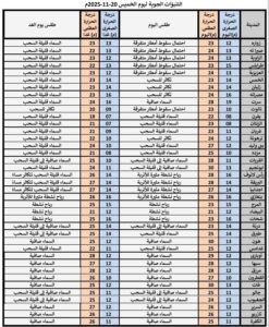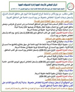 درجات الحرارة القصوى: تتراوح على اغلب المناطق مابين (22-28)مْ وتسجل تراجع يوم الغد وتسجل انخفاض ملحوظ من يوم السبت.