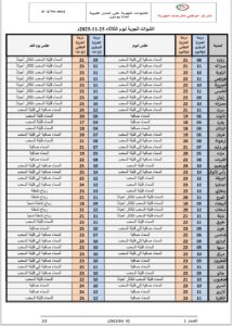 وستتراوح درجات الحرارة بين 18 و23 م°، على أن تنخفض بشكل واضح الخميس لتتراوح ما بين 10 و17 م° نهارًا، وتهبط إلى 3–7 م° ليلًا خاصة على المرتفعات.