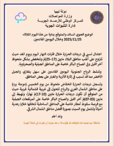 توقع المركز الوطني للأرصاد الجوية أن تشهد البلاد اعتدالًا نسبيًا في درجات الحرارة اليوم الثلاثاء وغدًا الأربعاء، قبل أن تتأثر أغلب مناطق الشمال الغربي بموجة برد قوية ابتداءً من يوم الخميس مصحوبة بانخفاض ملحوظ في الحرارة وفرصة هطول أمطار رعدية على بعض المناطق الساحلية.