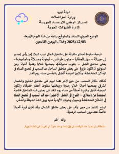 حالة السماء: فرصة سقوط أمطار متفرقة على المناطق من (رأس إجدير إلى مصراتة – سهل الجفارة – جنوب طرابس – ترهونة ومسلاتة وماجاورهما – بعض مناطق الجبل – جنوب مصراتة)، يصحبها خلايا رعدية أحياناً ومن المتوقع أن تكون غزيرة على بعض مناطق الساحل مما تسبب في تجمع المياه في الأماكن المنخفضة، وتكون الفرصة أفضل بدايةً من مساء يوم الغد.