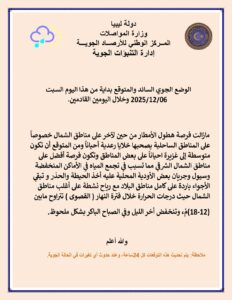 رأس إجدير حتى سرت – سهل الجفارة – الجبل الغربي: أمطار متفرقة قد تكون غزيرة على بعض المناطق الساحلية، مع رياح شمالية غربية تصل سرعتها إلى 60 كيلومتر/الساعة، ودرجات حرارة بين 12 و19 م°.