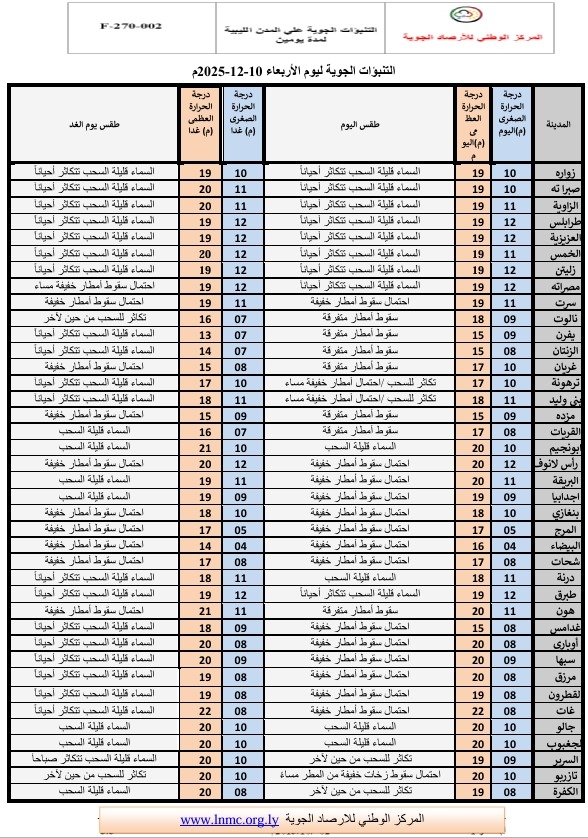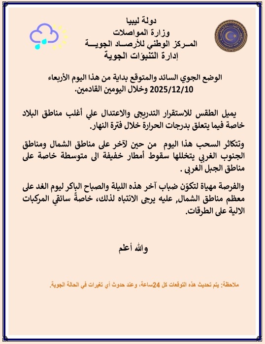 وجاء بيان الأحوال الجوية المتوقعة على ليبيا اليوم كالتالي