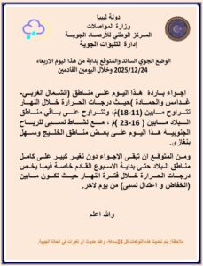 وجاء بيان الأحوال الجوية المتوقعة على ليبيا اليوم كالتالي: