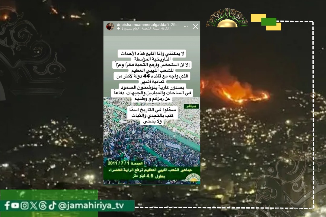 وجهت الدكتورة عائشة القذافي، تحية الفخر والاعتزاز للشعب الليبي العظيم، الذي وقف في وجه عدوان الناتو دفاعا عن الرمز القائد الشهيد معمر القذافي، والوطن نحو 8 أشهر يواجه جيوش 44 دولة بصدور عارية.