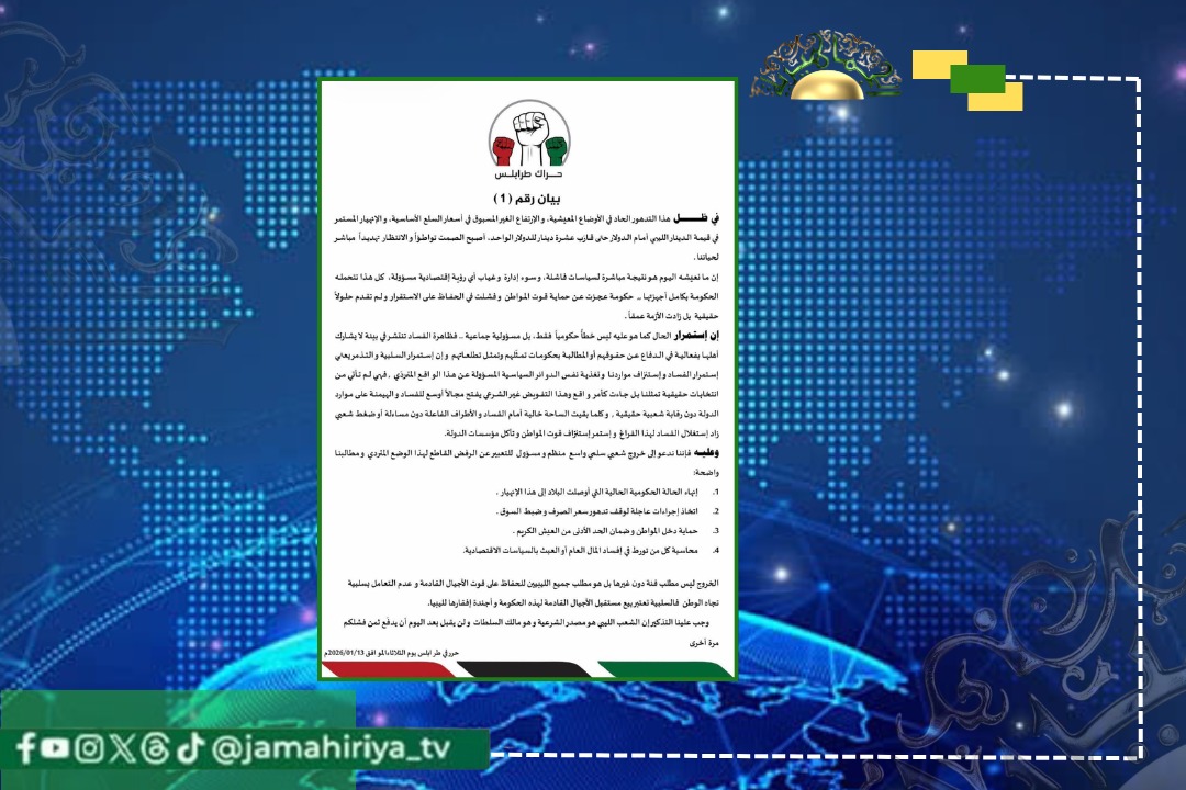 أصدر حراك طرابلس بيانه الأول، مطالبًا بتنظيم خروج شعبي سلمي للتعبير عن رفض التدهور الاقتصادي وارتفاع أسعار السلع الأساسية وانهيار الدينار الليبي، محمّلًا الحكومة المسؤولية الكاملة عن الوضع الراهن.