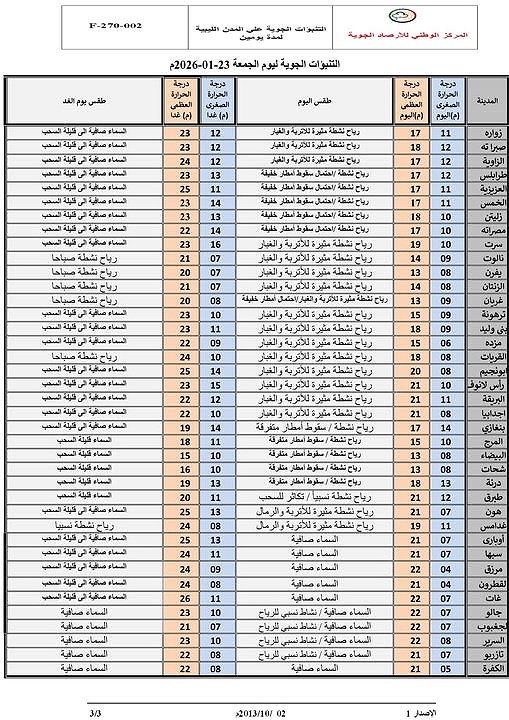 أما الجفرة – سبها – غات – غدامس – الحمادة: أجواء صافية إلى قليلة السحب، تتكاثر الأحد على غدامس والحمادة، رياح متغيرة الاتجاه تنشط الأحد مثيرة للأتربة، والحرارة بين 19-22 مْ ترتفع السبت وتنخفض الأحد.