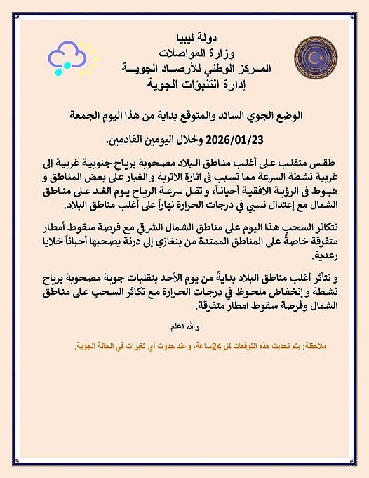والنظرة المستقبلية:ابتداءً من يوم الأحد، تتأثر أغلب مناطق ليبيا بتقلبات جوية مصحوبة برياح نشطة وانخفاض ملحوظ في درجات الحرارة.