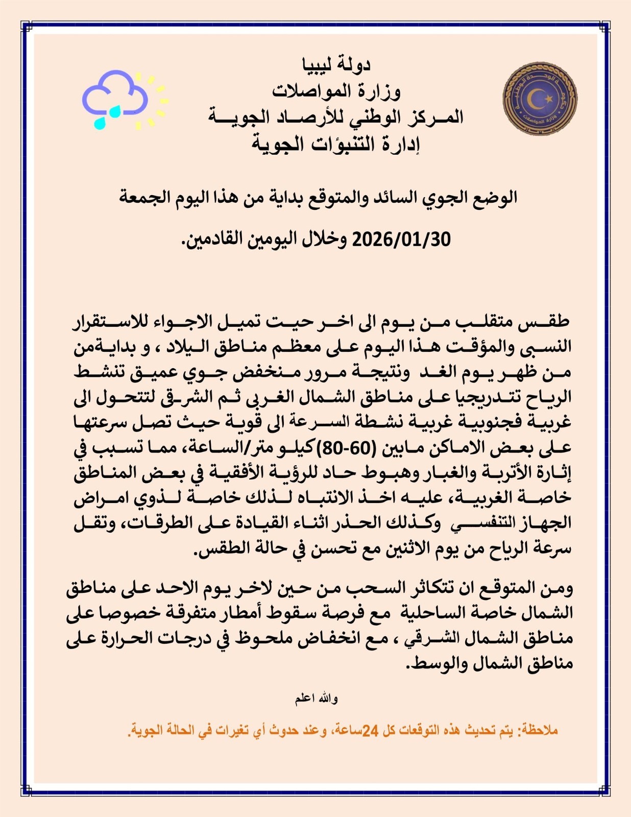 توقع المركز الوطني للأرصاد الجوية أن تشهد البلاد خلال الأيام الثلاثة القادمة تغيرات ملحوظة في الطقس، تبدأ من ظهر يوم السبت بنشاط قوي للرياح الجنوبية على مناطق الشمال الغربي، ما يتسبب في إثارة الأتربة والغبار وهبوط حاد في مستوى الرؤية الأفقية.