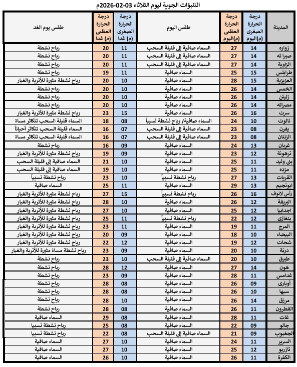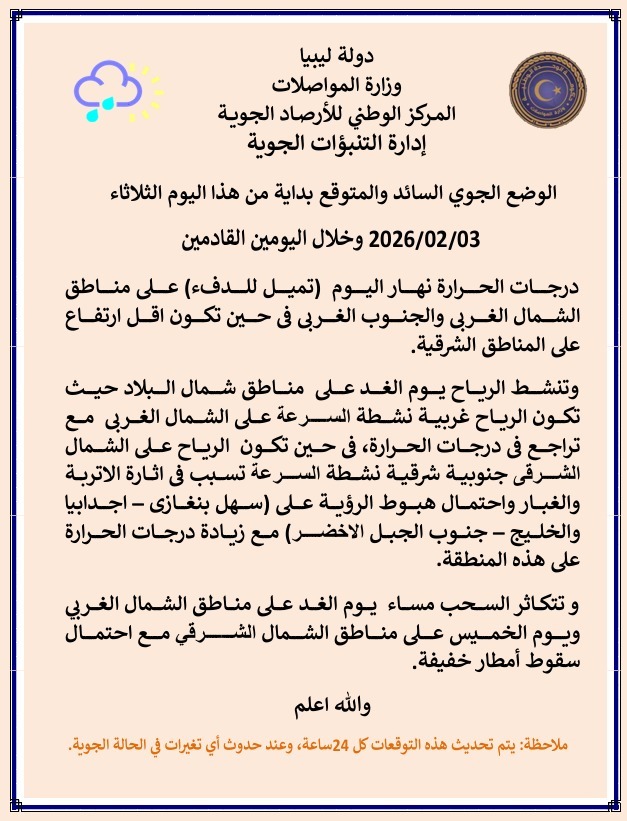 توقع مركز الأرصاد الجوية، وجود درجات حرارة تميل للدفء نهاراً اليوم على المناطق الغربية، مع نشاط للرياح يوم الغد على مناطق شمال ليبيا خاصة الشمال الشرقي مثيرة للأتربة والغبار.