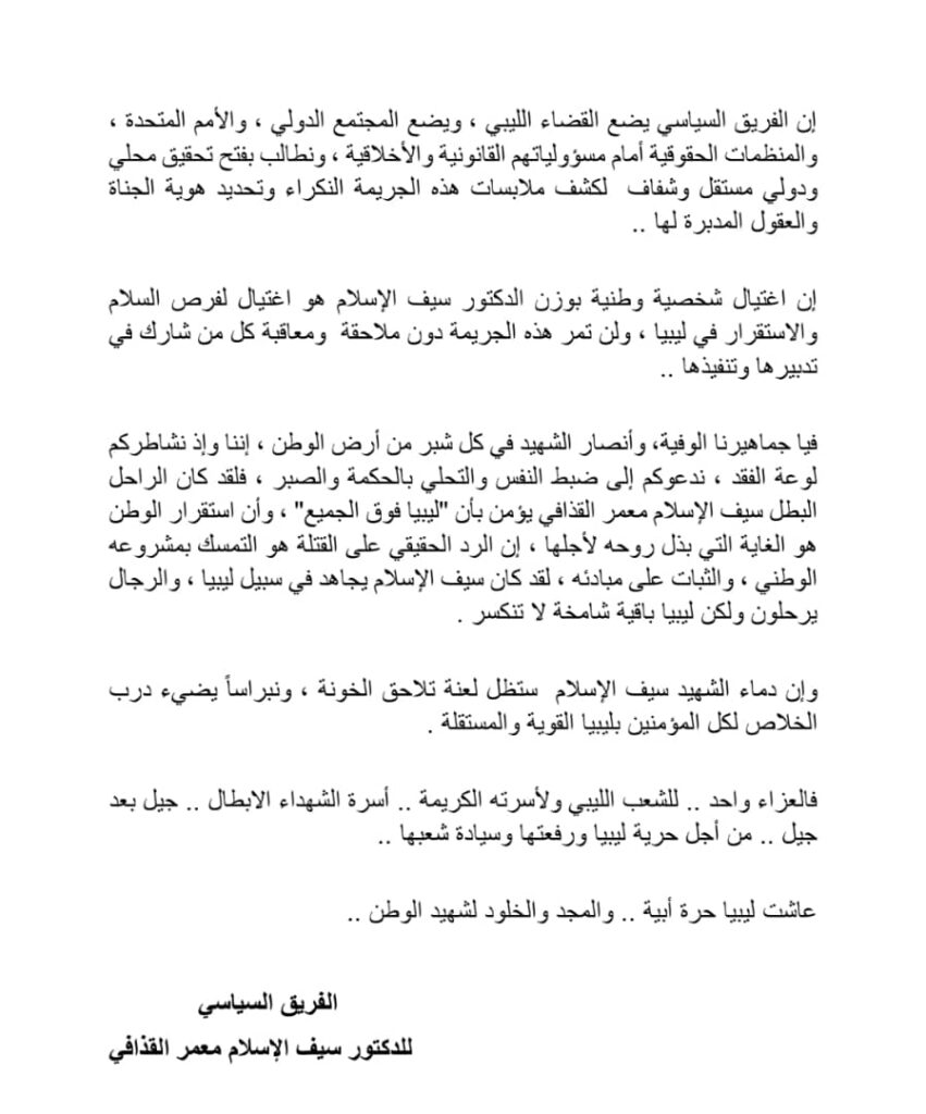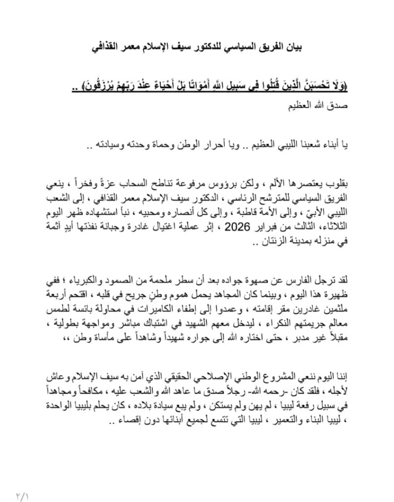 وأكد البيان أن الدكتور سيف الإسلام “ترجل فارساً بعد أن سطر ملحمة من الصمود والكبرياء”، مشيراً إلى أن اغتياله يمثل ضربة لمشروعه الوطني الإصلاحي الذي كان يسعى من خلاله إلى بناء ليبيا موحدة تتسع لجميع أبنائها.