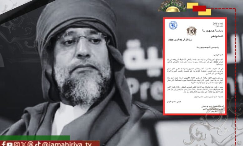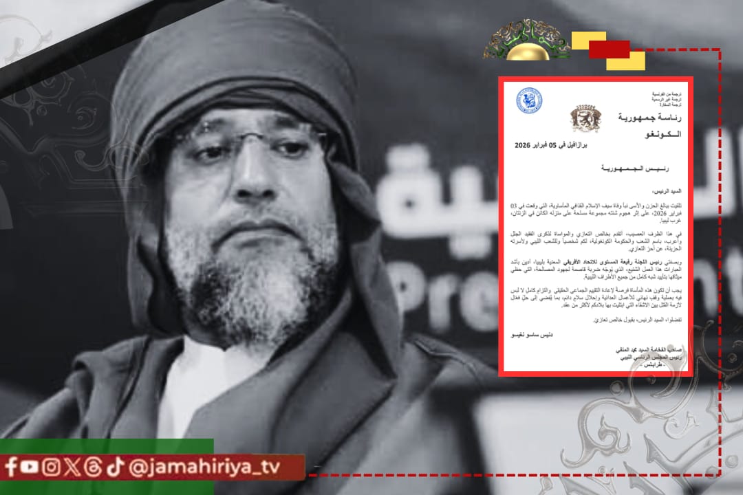 بعث رئيس جمهورية الكونغو رسالة تعزية إلى أسر الدكتور سيف الإسلام معمر القذافي، معبّرًا فيها عن بالغ حزنه وأسفه لوفاة الفقيد.