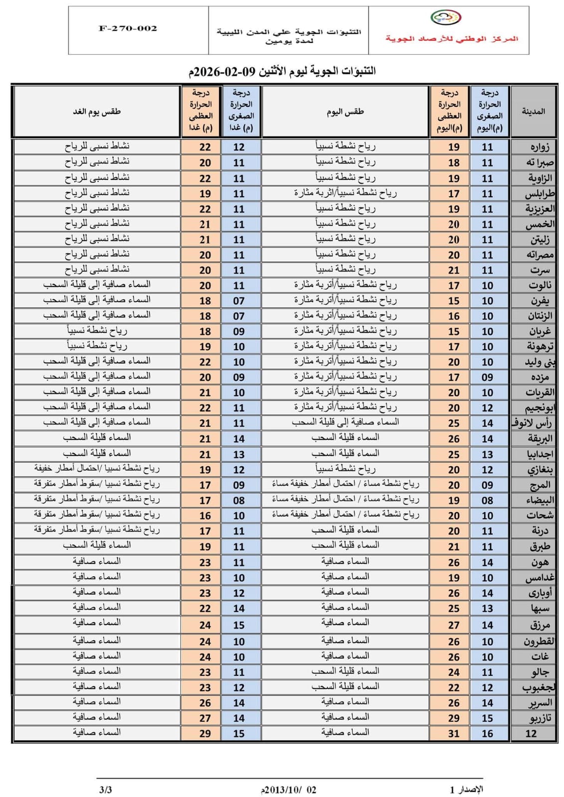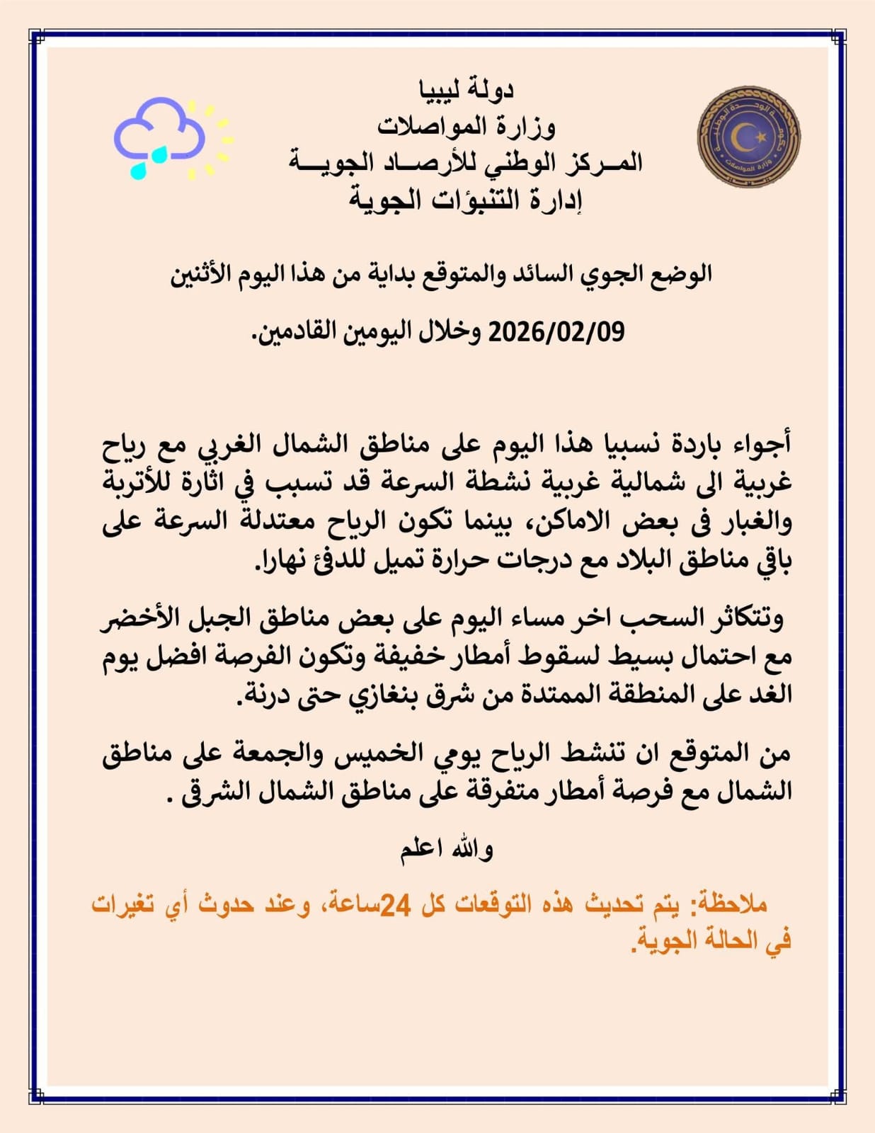 وجاء بيان الأحوال الجوية المتوقعة على ليبيا اليوم كالتالي: