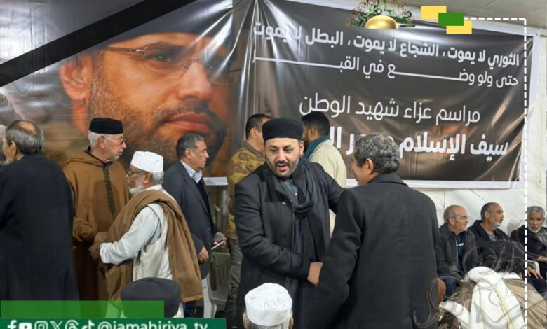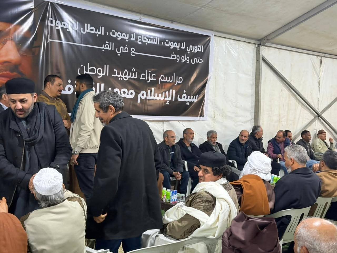 وجاء المشاركون لتقديم التعازي في وفاة الشهيد الصائم سيف الإسلام معمر القذافي، مؤكدين على استمرار المسيرة الوطنية والقيم التي جسدها الشهيد في حياته ومواقفه.