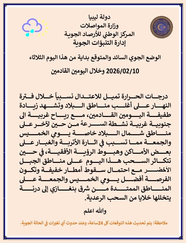 سحب متفرقة مع احتمال أمطار خفيفة اليوم على الجبل الأخضر، وفرصة أفضل مساء الخميس والجمعة خاصة شرق بنغازي حتى درنة، قد تصحبها خلايا رعدية. الحرارة بين 16 و20 مْ مع ارتفاع تدريجي.