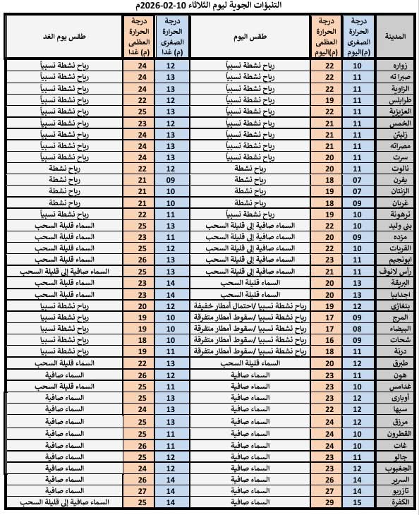 توقع المركز الوطني للأرصاد الجوية أن تشهد ليبيا خلال الأيام الثلاثة القادمة أجواءً معتدلة نهاراً على معظم المناطق، مع نشاط ملحوظ للرياح على الشمال ابتداءً من يوم الخميس، ما قد يتسبب في إثارة الأتربة والغبار.