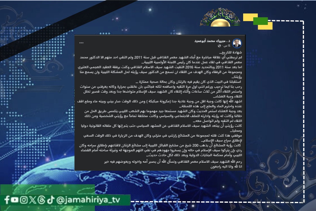 كتب الدكتور مبروك أبو عميد، شهادة للتاريخ على صفحته في حق الشهيد سيف الاسلام القذافي ولقاءاته به.