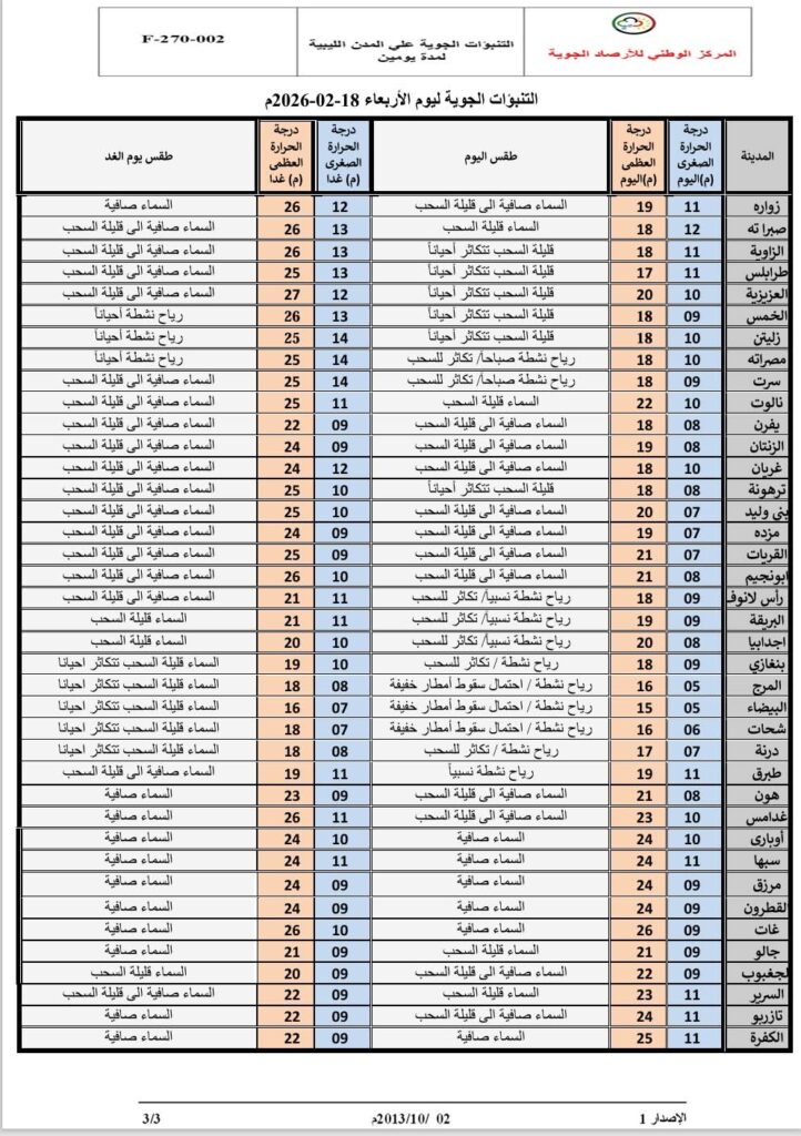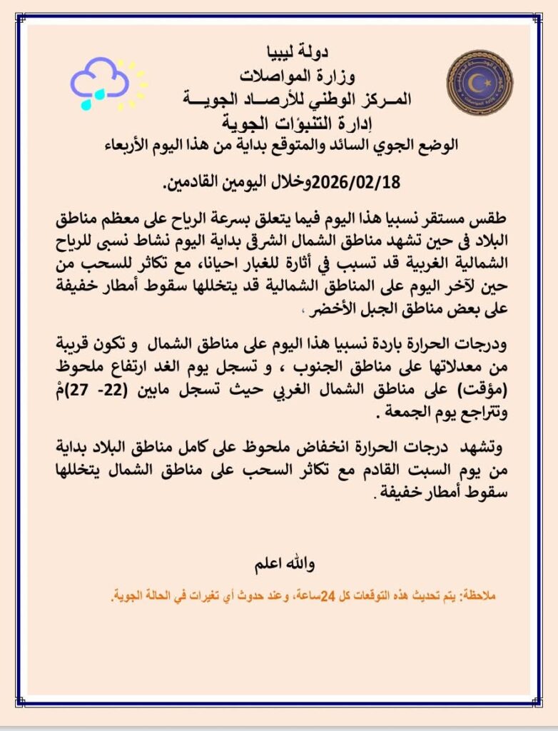 أوضح أن مناطق الخليج وسهل بنغازي حتى امساعد قد تشهد أمطاراً خفيفة على الجبل الأخضر، مع نشاط للرياح الساحلية اليوم وانخفاض سرعتها مساءً، ثم تنشط مجدداً الجمعة خاصة على بنغازي والجبل الأخضر.