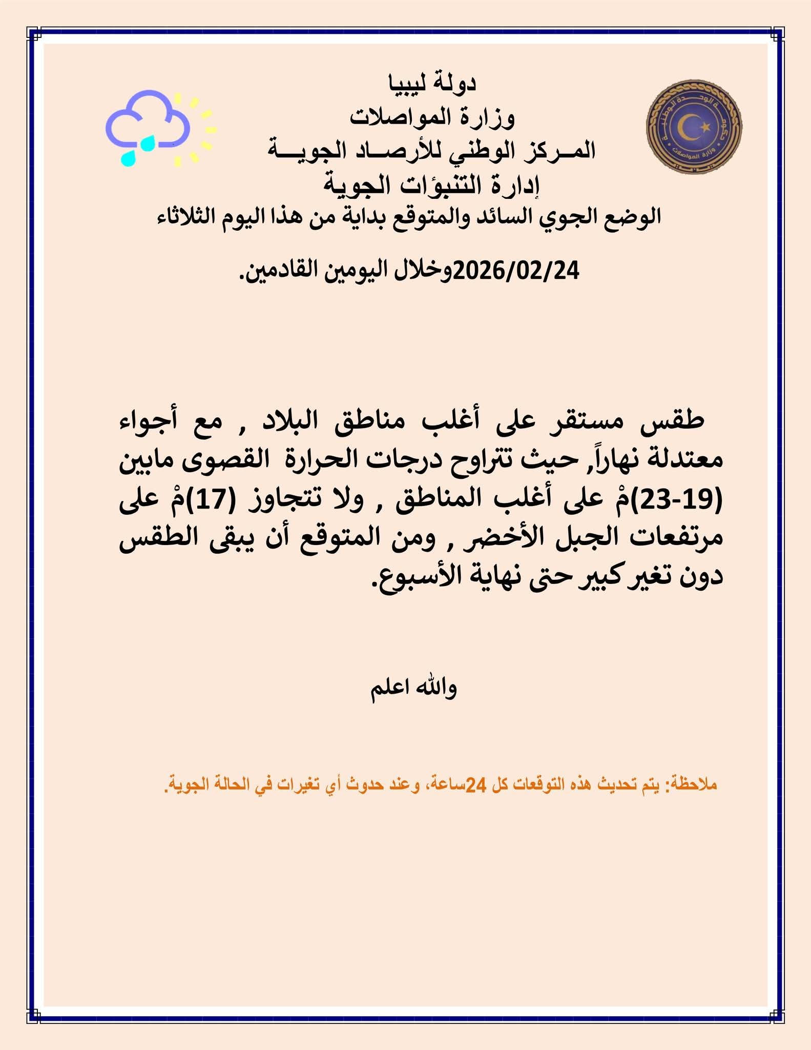 توقع مركز الأرصاد الجوية، وجود طقس مستقر على أغلب المناطق الليبية اليوم الثلاثاء.