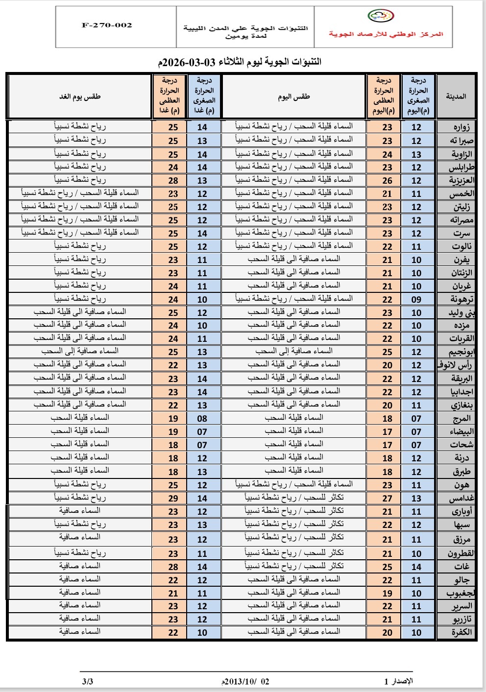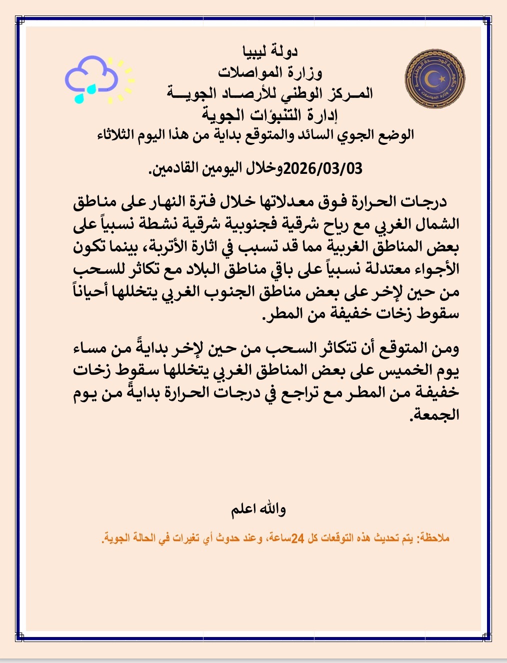 وجاء بيان الأحوال الجوية المتوقعة على ليبيا اليوم كالتالي: