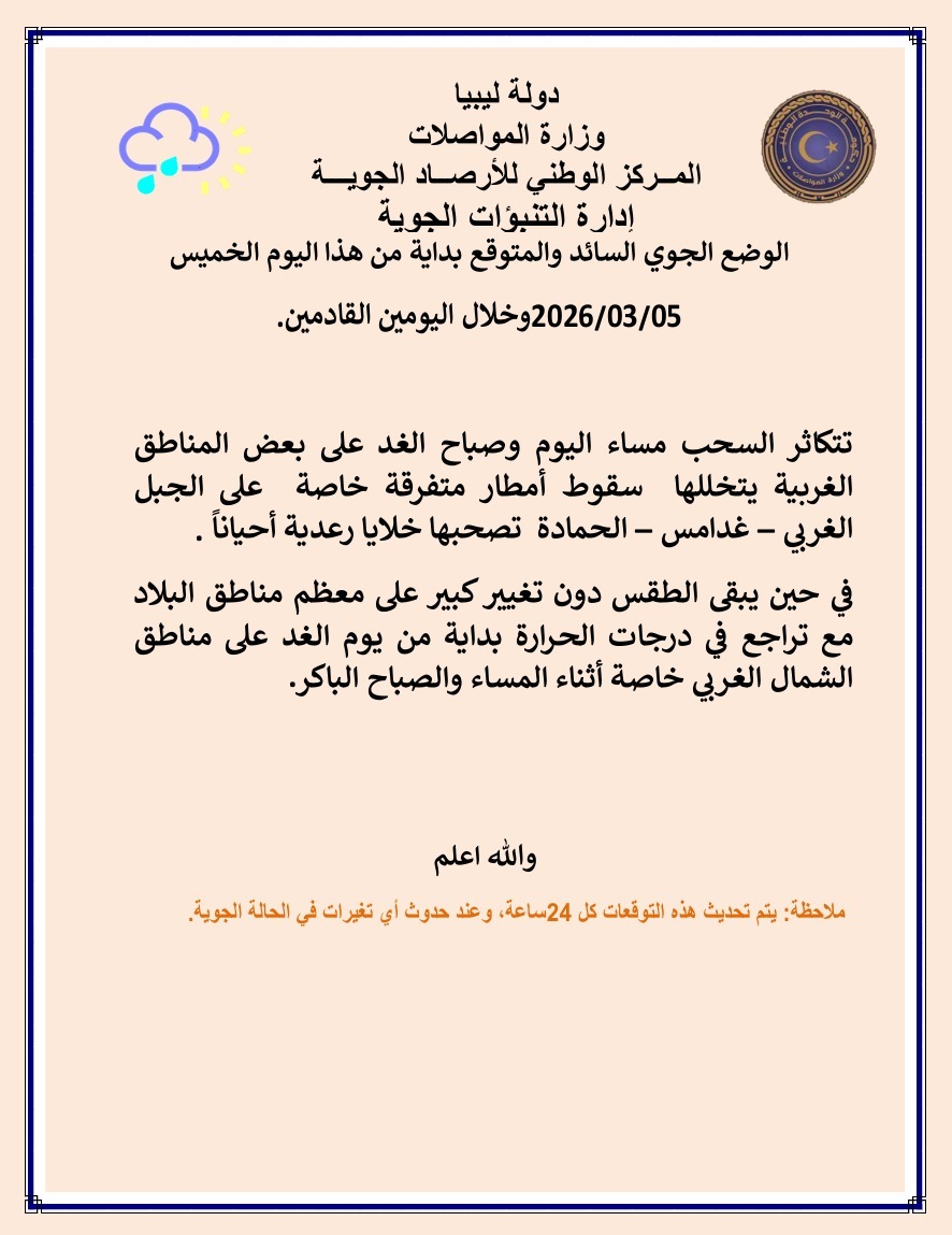 توقع مركز الأرصاد الجوية، فرصة سقوط أمطار متفرقة مساء اليوم على بعض مناطق الشمال الغربي خاصة على الجبل الغربي -غدامس – الحمادة تصحبها خلايا رعدية أحياناً.
