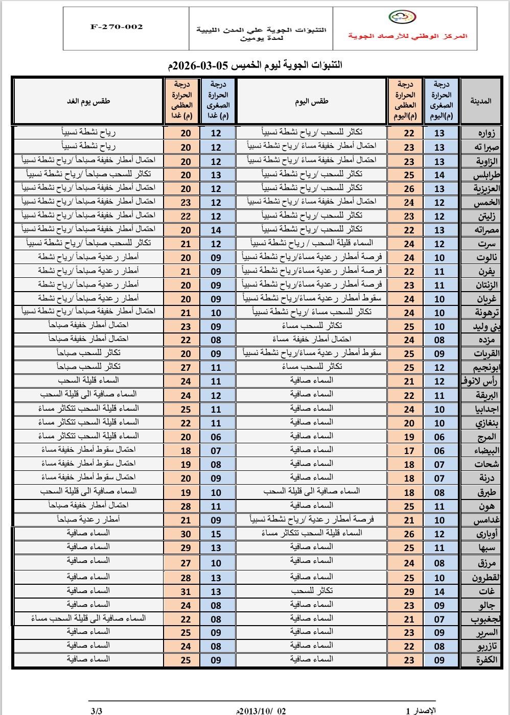 وجاء بيان الأحوال الجوية المتوقعة على ليبيا اليوم كالتالي: