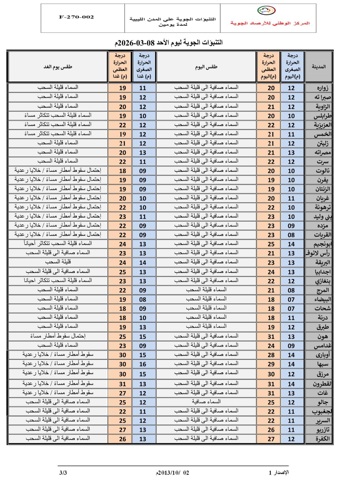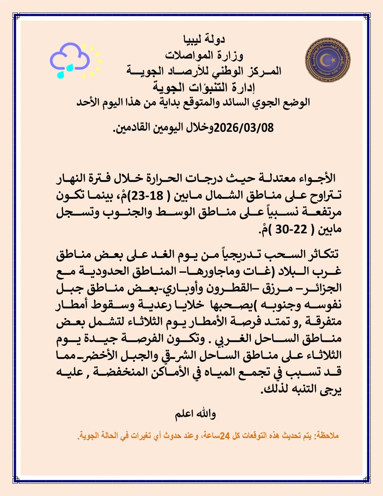 وجاء بيان الأحوال الجوية المتوقعة على ليبيا اليوم كالتالي: