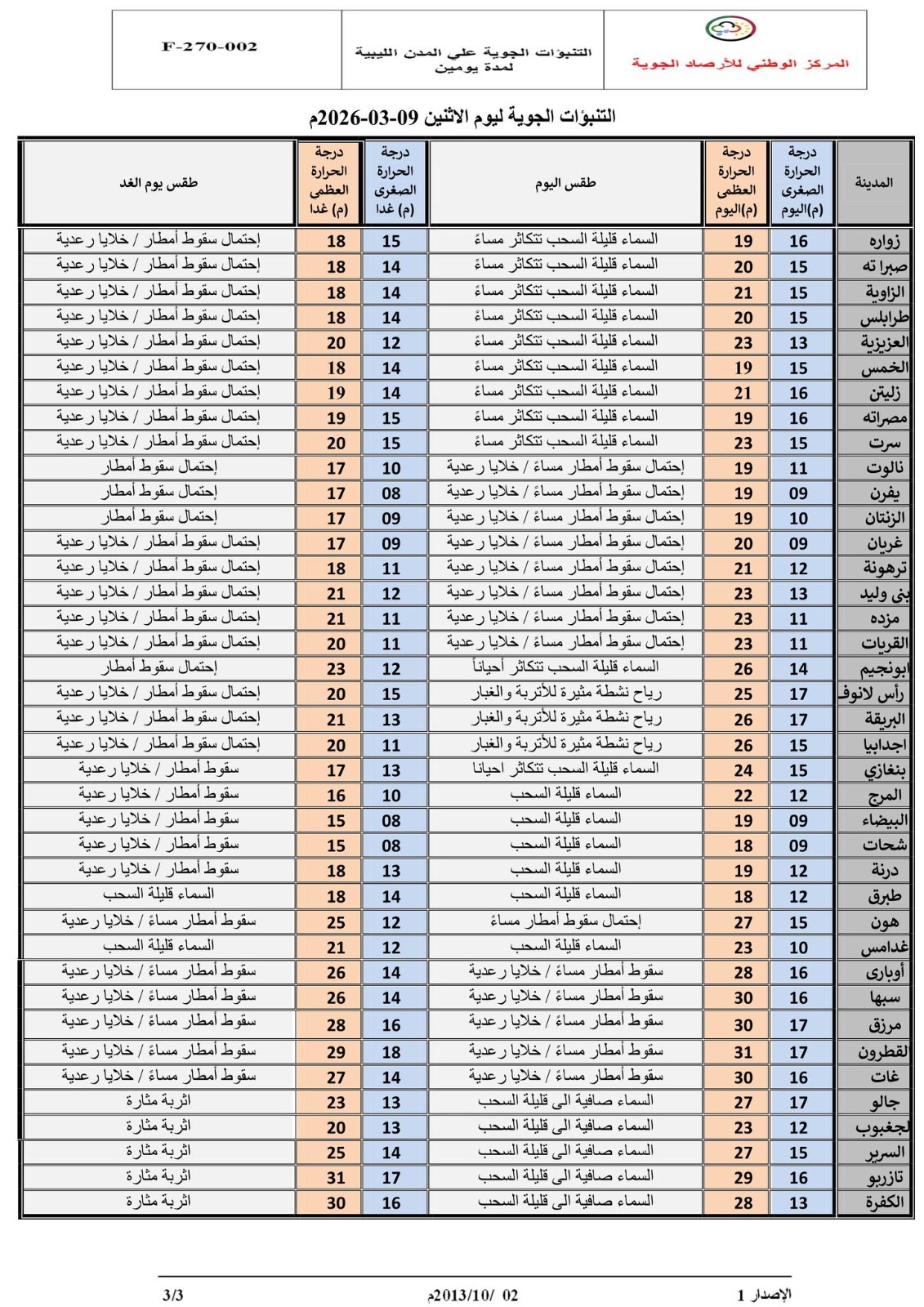 توقع المركز الوطني للأرصاد الجوية تكاثر السحب على مناطق مختلفة ابتداءً من اليوم الاثنين مع فرص متزايدة لسقوط أمطار رعدية خاصة على المناطق الغربية والجنوب الغربي، لتشمل يوم الغد مناطق الشمال الشرقي.
