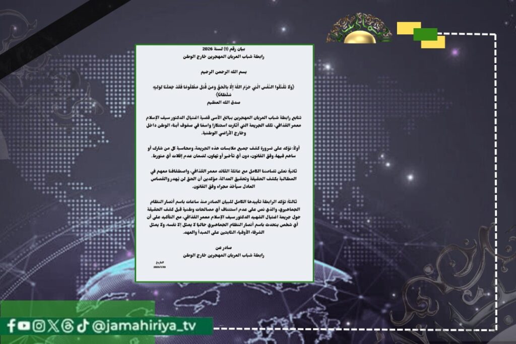 و أعلنت الرابطة تضامنها الكامل مع عائلة القائد معمر القذافي، مؤكدة الوقوف معهم في المطالبة بكشف الحقيقة وتحقيق العدالة، وضمان أن يأخذ القصاص العادل مجراه وفق القانون.