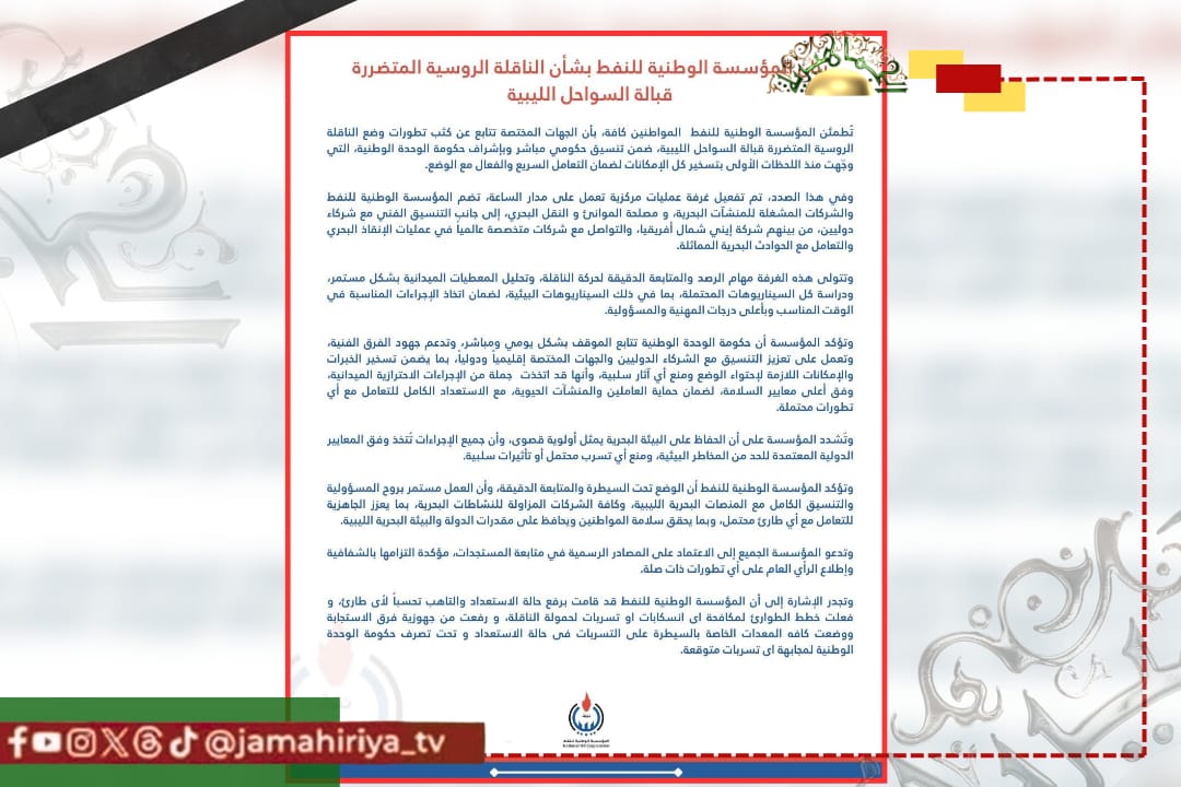 -أكدت مؤسسة النفط متابعة تطورات وضع الناقلة الروسية المتضررة بشكل مستمر، بالتنسيق مع حكومة الدبيبة.