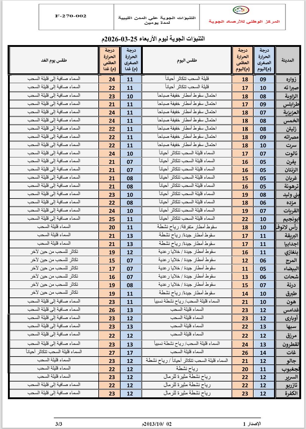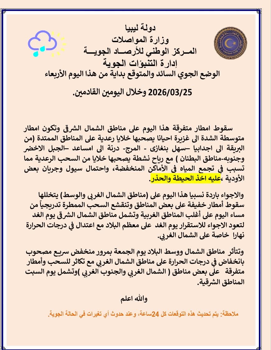 وجاء بيان الأحوال الجوية المتوقعة اليوم على ليبيا كالتالي: