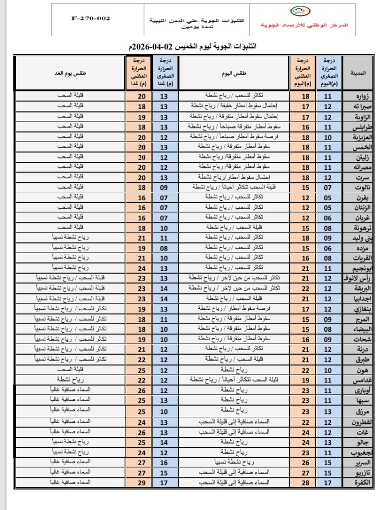 المناطق الغربية (رأس إجدير حتى سرت – سهل الجفارة – الجبل الغربي): سحب متفرقة مع أمطار اليوم، تتحسن الأجواء جزئياً غداً الجمعة، ثم تعود السحب للتكاثر السبت.