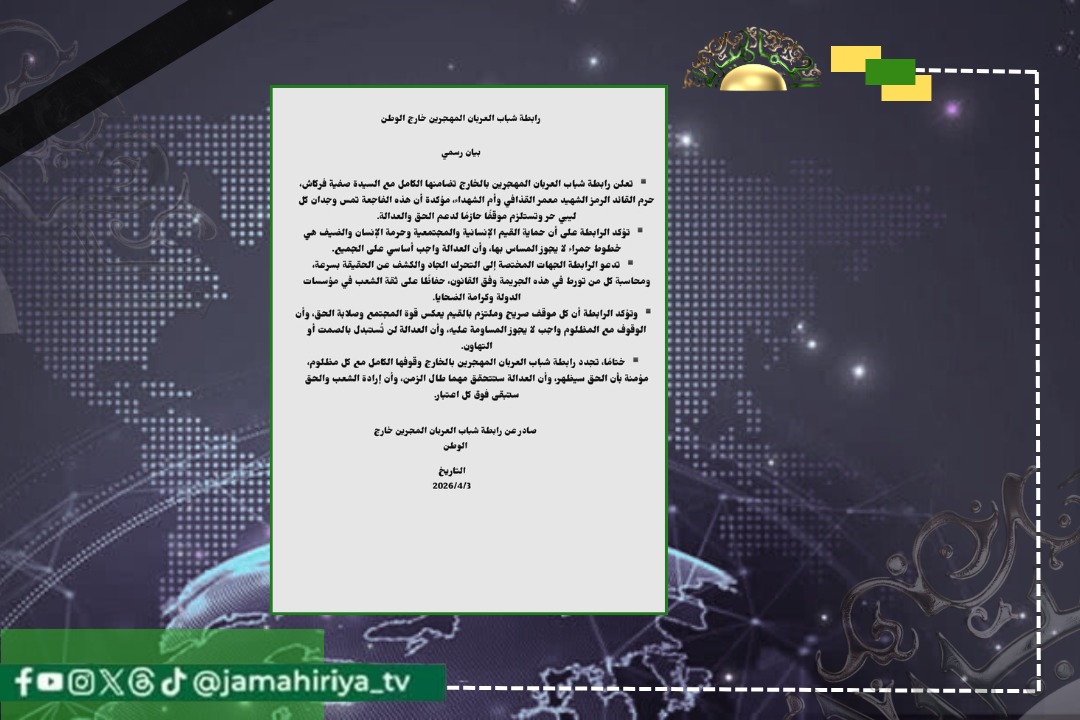 أعلنت رابطة شباب العربان المهجرين بالخارج، تضامنها الكامل مع السيدة صفية فركاش. حرم القائد الشهيد معمر القذافي وأم الشهداء.