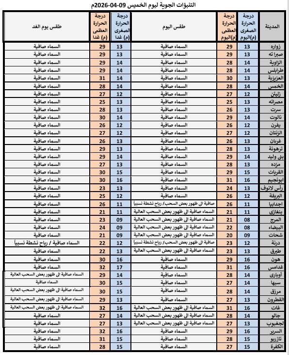 المناطق الغربية (رأس إجدير حتى سرت، سهل الجفارة الجبل الغربي): أجواء صافية، رياح خفيفة تتحول السبت إلى جنوبية شرقية معتدلة، ودرجات الحرارة بين 23 و30 م°.