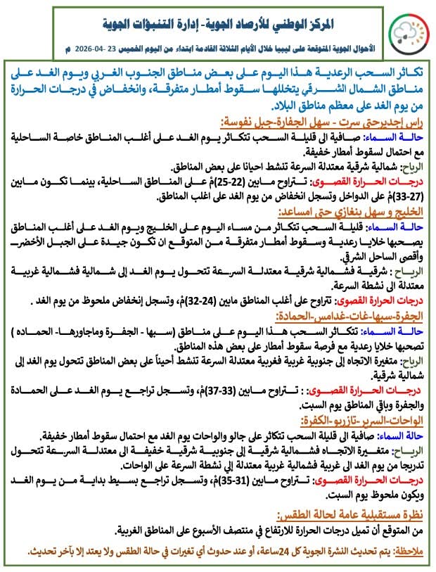 في رأس إجدير حتى سرت – سهل الجفارة – الجبل الغربي: السماء صافية إلى قليلة السحب، تتكاثر غداً خاصة على الساحل مع احتمال أمطار خفيفة، والحرارة بين 22 و25 مْ على الساحل و27 إلى 33 مْ على الدواخل.