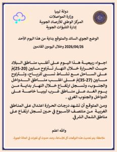 أفاد مركز الأرصاد الجوية بأن الطقس يميل للاعتدال اليوم على أغلب المناطق، وتسجل درجات الحرارة ارتفاع خلال النهار بداية من الغد على مناطق غرب ليبيا.