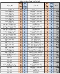 درجات الحرارة القصوى: تتراوح ما بين 23-29م، وتسجل زيادة خلال اليومين القادمين خاصة على الدواخل.