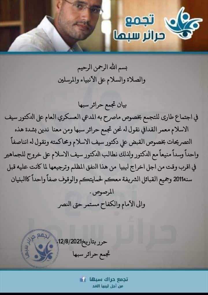 وشدد تجمع حرائر سبها، أن جميع القبائل الليبية الشريفة مع الدكتور سيف الإسلام القذافي، لحمايته والدفاع عنه والوقوف صفا واحدًا كالبنيان المرصوص.
