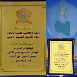 بمناسبة حلول الذكرى الـ 32 ليوم الوفاء، خصصت رابطة الإعلاميين الليبيين بالخارج هذا اليوم للمرحومة باذن الله المحامية مبروكة دوه التي تبنت قضية اللواء الساعدي معمر القذافي دون أن تشترط تقاضي أي مبلغ مالي، في وقت اشترط فيه محامي ليبي معروف مبلغ مليوني دولار لكي يتبنى القضية.