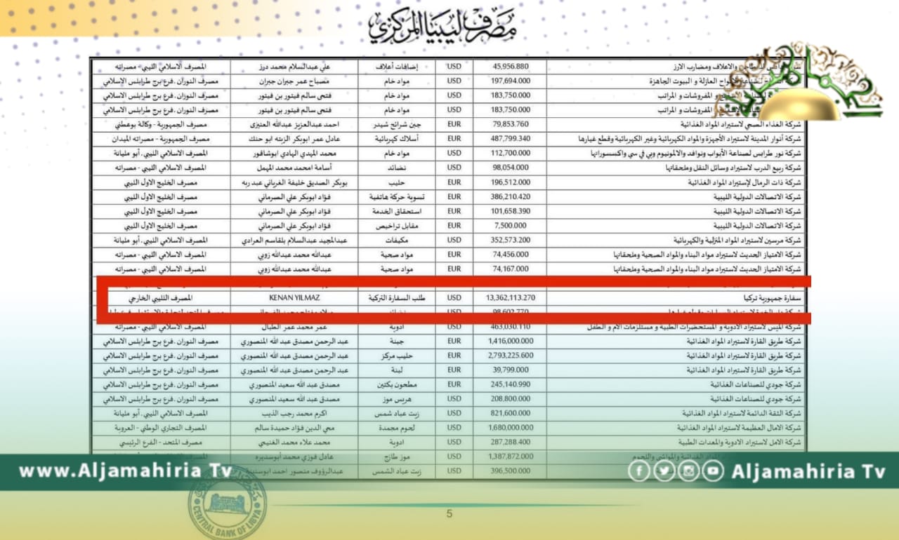 وسط فوضى حقيقية، ودون توضيح السبب، أظهرت الاعتمادات المستندية، التي نشرها مصرف ليبيا المركزي على صفحته مؤخرا، فتح اعتماد مستندي للسفارة التركية في البلاد.