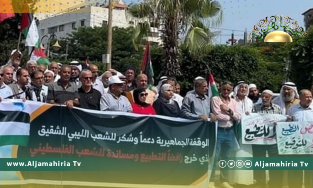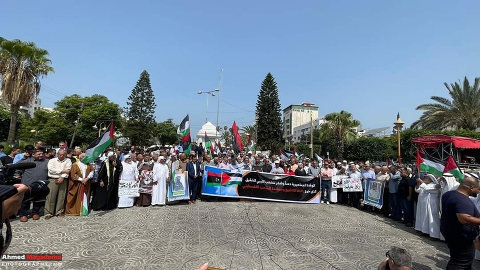 نظم أهالي مدينة غزة، وقفة احتجاجية داعمة لموقف الشعب الليبي وانتفاضته ضد التطبيع الذي تقوم به حكومة الدبيبة في طرابلس، والهبّة الشعبية والغضب ضد وزيرة الخارجية الموقوفة، نجلاء المنقوش إثر لقائها السري في روما، مع وزير خارجية الكيان الصهويني إيلي كوهين.