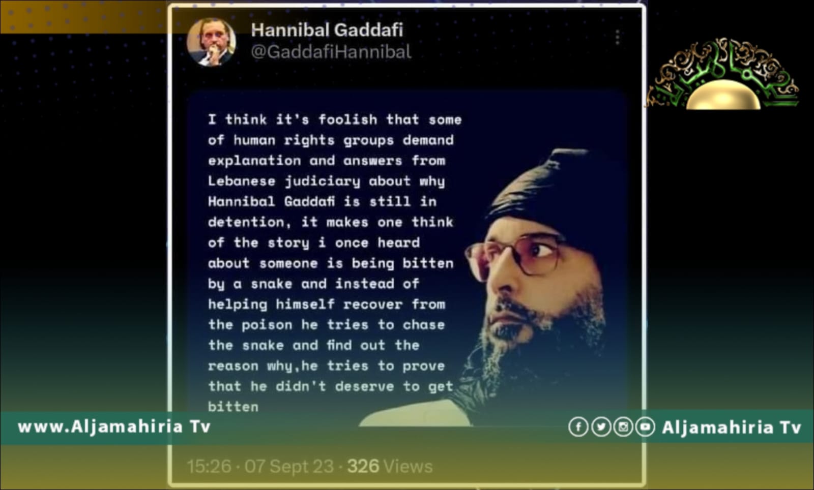 أكد حساب الكابتن هانيبال القذافي عبر منصة X، أنه من الحماقة مطالبة حقوق الإنسان بتفسير موقف القضاء اللبناني بشأن بقاء هانيبال قيد الاحتجاز.