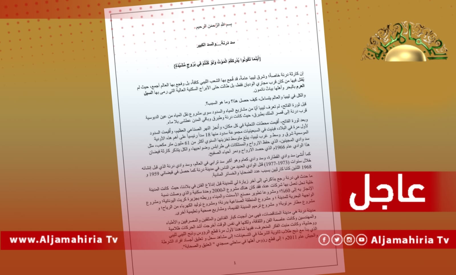 عاجل/ المترشح الرئاسي سيف الإسلام القذافي: كارثة درنة خاصة وشرق ليبيا عامة قد فُجع بها الشعب الليبي كافة بل وفجع بها العالم أجمع حيث لم يقتل فيها من كان قرب مجاري الوديان فقط بل طالت حتى الأبراج السكنية العالية التي رمى بها السيل العرم بالبحر وأهلها بياتّ نائمون والكل في ليبيا والعالم يتساءلون كيف حصل هذا؟ وماهو السبب؟