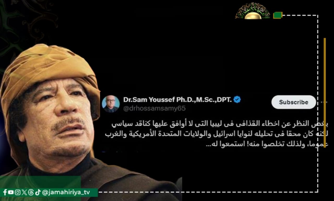 كشف الطبيب الأمريكي الذي ينتمي إلى أصول مصرية سام يوسف، أن القائد الشهيد معمر القذافى كان محقًا فى تحليله لنوايا الكيان الصهيوني والولايات المتحدة الأمريكية والغرب عمومًا، ولذلك تخلصوا منه.