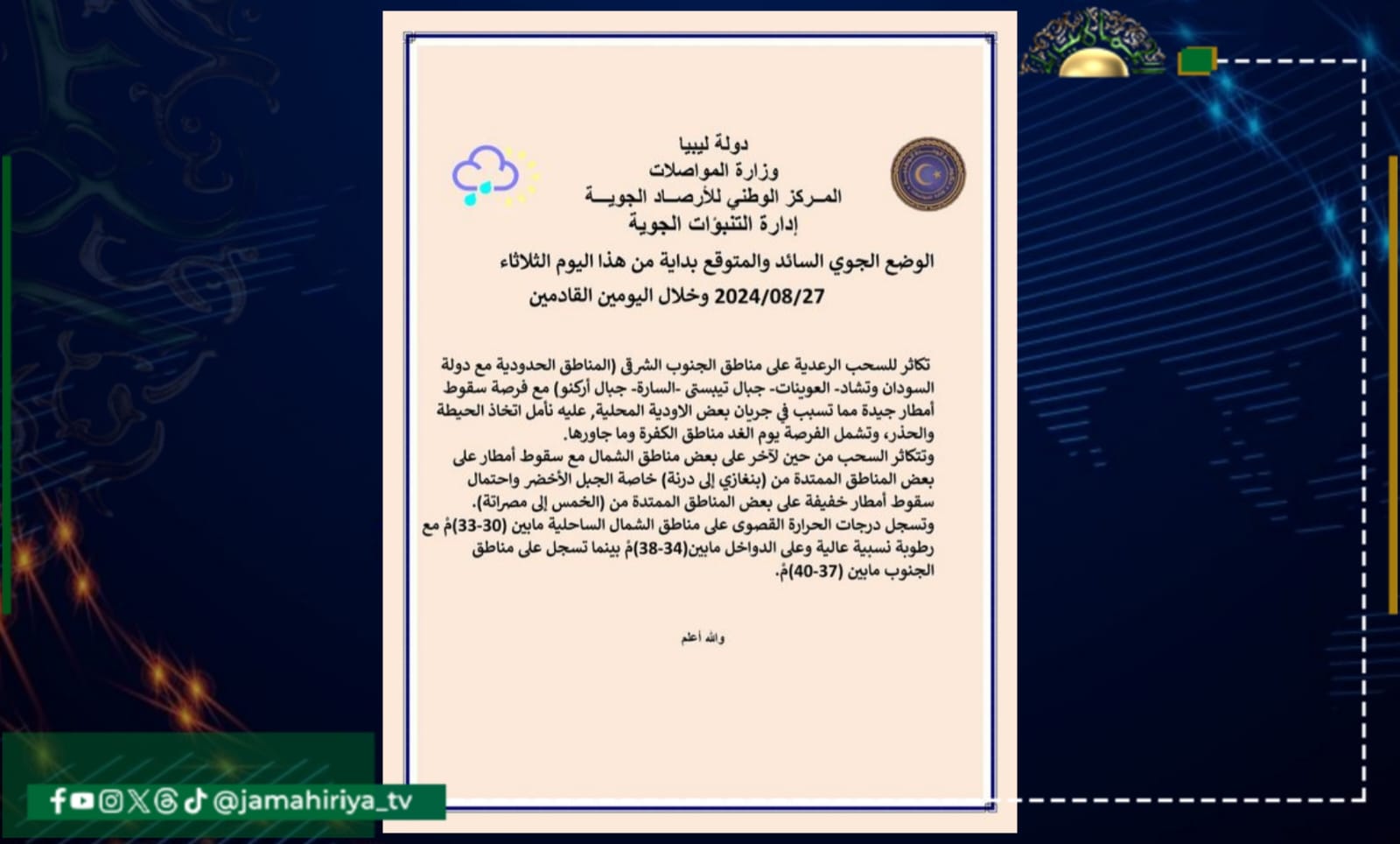 وجاء بيان الأحوال الجوية المتوقعة على ليبيا اليوم كالتالي:-