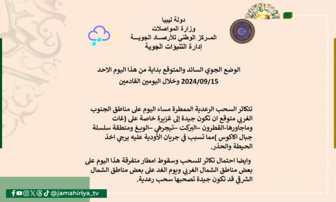 توقع مركز الأرصاد الجوية تكاثر السحب الرعدية الممطرة مساء اليوم على مناطق الجنوب الغربي متوقع ان تكون جيدة إلى غزيرة خاصة على (غات وماجاورها – القطرون – البركت – تيجرهي – الويغ ومنطقة سلسلة جبال اكاكوس) مما تسبب في جريان الأودية عليه يرجي اخذ الحيطة والحذر.