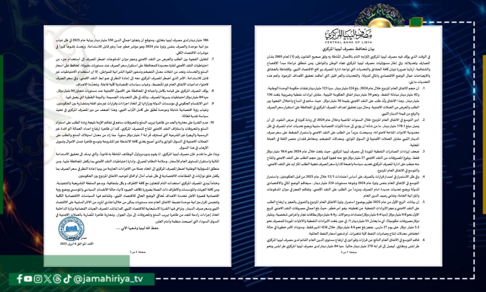 عاجل// مصرف ليبيا المركزي يحذر: بيانات الربع الأول من عام 2025 تظهر بوضوح استمرار وتيرة الانفاق العام المزدوج والتمويل بالعجز.