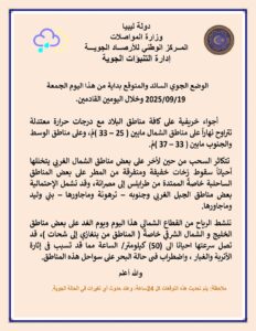 أعلن المركز الوطني للأرصاد الجوية، في نشرته الصادرة اليوم الجمعة 19 سبتمبر 2025، أن البلاد تشهد أجواء خريفية مستقرة نسبياً خلال الأيام الثلاثة المقبلة، مع تكاثر للسحب على بعض مناطق الشمال الغربي، قد يتخللها سقوط زخات خفيفة من المطر، خاصة على المناطق الممتدة من طرابلس إلى مصراتة، والدواخل المجاورة مثل ترهونة وبني وليد وبعض مناطق الجبل وجنوبه.