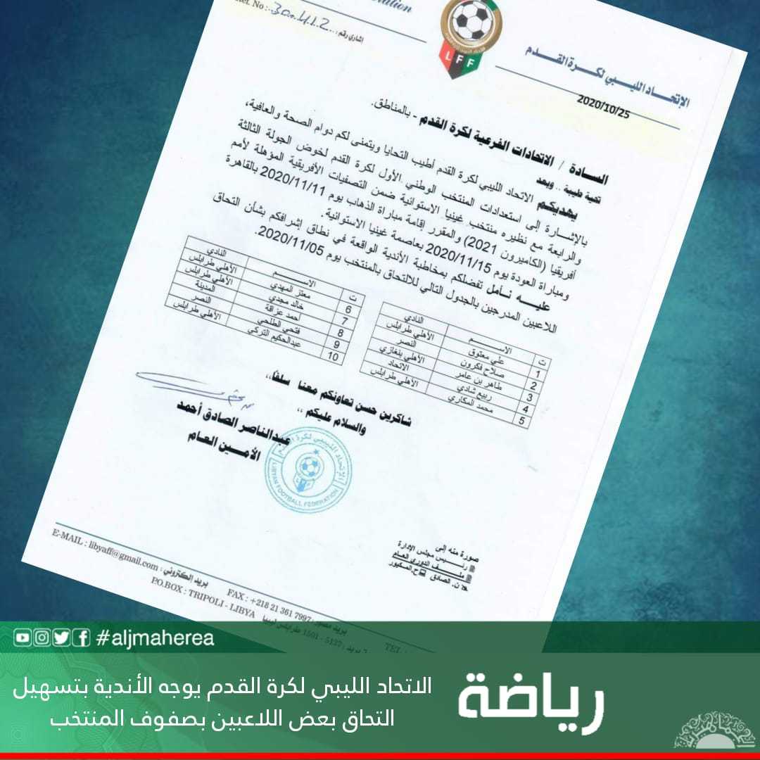 طالب الأمين العام للاتحاد الليبي لكرة القدم عبد الناصر الصادق أحمد، في رسائل وجهها إلى الاتحادات الفرعية لكرة القدم، بتسهيل إجراءات ومخاطبة الأندية الواقعة في نطاق إشرافهم بشأن التحاق اللاعبين المدرجين بالجدول بصفوف المنتخب يوم 5 نوفمبر المقبل.
