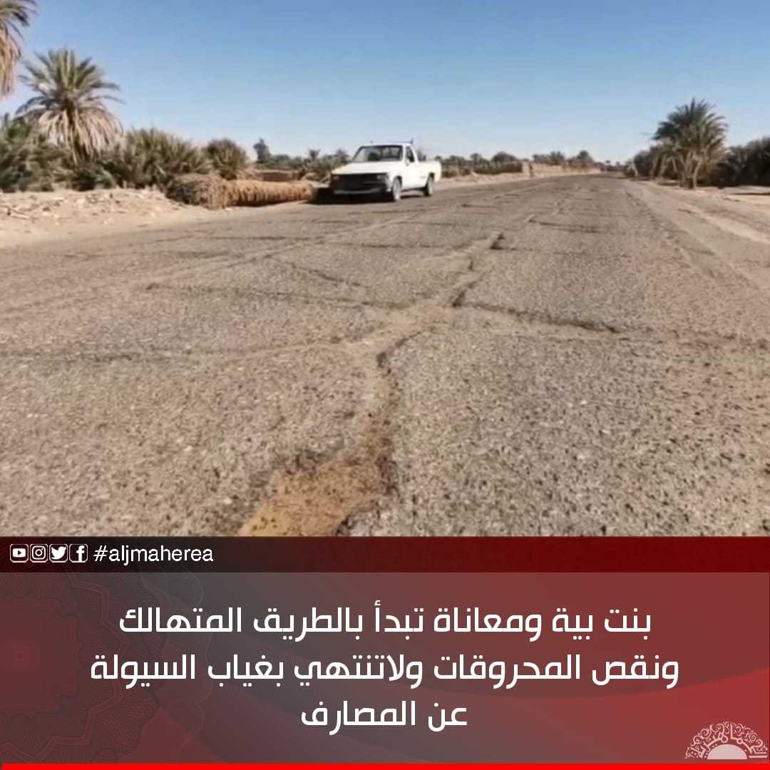 طالب الأهالي المزارعون ببلدية بنت بية مصلحة الطرق والمواصلات والنقل، بتحديث الطريق المتهالك الذي يصلهم بمزارعهم لانهاء معاناتهم التي استمرت خمسة عشر عاما، حيث لم يعد الطريق صالحا وتسبب في تهالك سياراتهم ومعداتهم الزراعية.