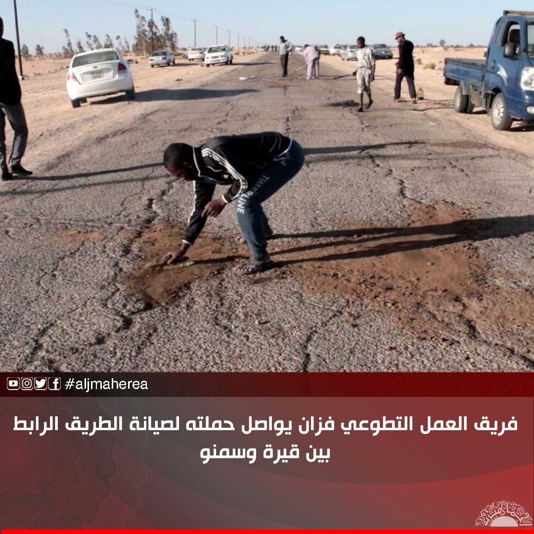 قام فريق العمل التطوعي فزان بحملة لصيانة الطريق الرابط بين قيرة وسمنو والتي تهالكت وتسببت في حوادث سير وحوادث فقد فيها الكثيرين حياتهم .